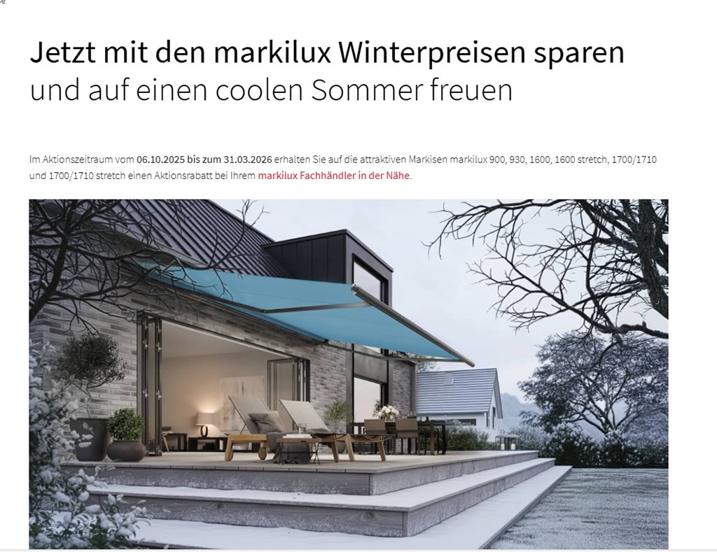 Sie machen aus jedem strahlenden und heißen Sonnentag einen erholsamen Urlaubstag. Ob Terrasse, Balkon, Fassade oder Schaufenster - das große Markisen-Programm bietet für jeden Ihrer Anwendungsbereiche die optimale Verschattungslösung.
